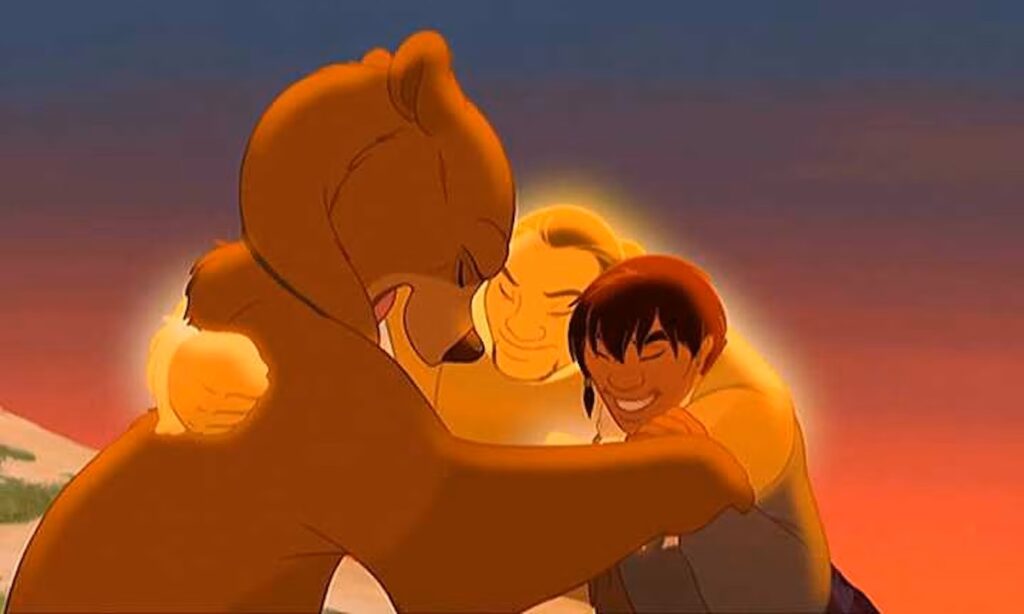 L’unico, vero trait d’union delle migliori produzioni Disney a cavallo del millennio è lo sceneggiatore Tab Murphy (Il Gobbo di Notre Dame, Tarzan, Atlantis) che, stavolta, instrada il plot (che piacerebbe a John Boorman) in un percorso di formazione un po’ scontato. Di Tarzan si replica anche l’apporto musicale di Phil Collins, in un tour de force che l’ha visto interpretare le sue canzoni (“Great spirits” è invece di Tina Turner) anche in italiano, francese, tedesco, giapponese e spagnolo. I due registi, esordienti, erano supervisori dell’animazione in Mulan e, se Aaron Blaise ha animato Pocahontas, sempre incentrato su simili “nativi americani”, Robert Walker è stato layout artist in Lilo & Stitch (e c’è una bambina uguale a Lilo): il loro tratto è abbastanza standard, sono invece notevoli gli sfondi naturali ispirati ai paesaggi di Albert Bierstadt. I due buffi comprimari alci, Rocco e Fiocco, sono modellati sui rispettivi doppiatori, Rick Moranis e Dave Thomas, famosi (solo in U.S.A.) proprio per questi caratteri di canadesi sciocchi.