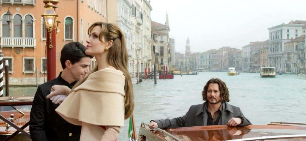 Le prime scene di “sorveglianza speciale” sono l’unico link possibile con Le Vite degli Altri: questo Intrigo Internazionale che traduce l’Anthony Zimmer di Jérome Salle (2005) nei più mercantili e ritriti canoni hollywoodiani non conserva alcun pregio della precedente opera del regista rivelando, altresì, tutti i limiti di un autore che non sa maneggiare i tempi della commedia, miscelare i registri, pennellare tocchi di classe (non funzionano il Giano bifronte e la sigaretta ad acqua; solo l’“I love you” silente), di glamour (la direzione dei figuranti rapiti dalla Jolie!) o romantici (il ballo Jolie/Depp). Un thriller Frantic che confonde tensione e ironia, una commedia sentimentale e d’azione priva di leggerezza, una comicità imbarazzante in stile La Pantera Rosa (le scene con Frassica e Marcoré): il ridicolo involontario nasce dall’aderenza realistica che passa senza soluzione di continuità, ad esempio, al superomismo 007iano (vedi il villain di Berkoff platealmente crudele o la fuga di Depp sotto il naso di Bettany) o alla favola da Vacanze Romane (il lieto fine con Timothy Dalton che benedice i fuggiaschi), denudando tutti i meccanismi ammiccanti della regia, comprese le insistite vedute aeree di Venezia e l’eccedenza di violini. Henckel Von Donnersmarck, in realtà, punta tutto sulla tensione erotica fra i due protagonisti, ma si gioca il film nella fondamentale scena del loro incontro sul treno, facendo recitare Angelina Jolie come una femme fatale troppo consapevole del proprio fascino. La scintilla non scatta, ma tutte le scene a seguire si comporteranno come se ci fosse stata, contando su un inesistente effetto di amore trattenuto. Il colpo di grazia (come nell’originale di Salle) lo dà il coup de théatre finale (pure prevedibile) che, rimettendo tutto in discussione, non regge il rewind consapevole, rendendo manifesti anche alcuni inganni ai danni dello spettatore (il sogno erotico di Depp e tutte le volte che quest’ultimo, anche solo, continua a “recitare”).
