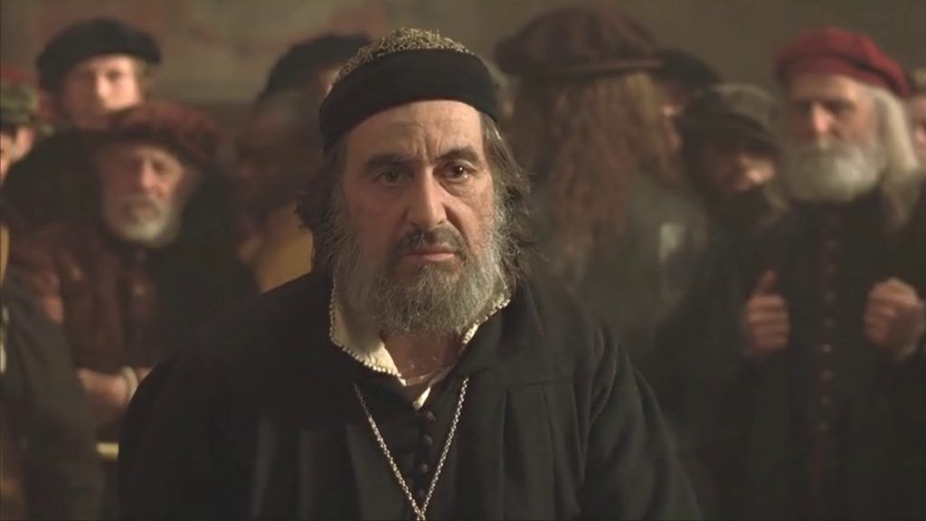 Michael Radford recapita un corretto adattamento scespiriano che punta forte sul gioco attoriale: fin dall’inizio si barcamena tra suggestioni personali e soluzioni didascaliche (la voice off introduttiva), restituendo una laguna a tinte fosche adeguatamente smorzata dallo scetticismo dell’ironia. Il classico montaggio alternato della narrazione corale è riscattato da una secchezza di fondo, essendo il quadro d’ambiente spesso tratteggiato con poche essenziali battute (gli sputi contro gli ebrei: la condotta di Shylock non è dunque intrinsecamente malvagia, ma soltanto un anello nel circolo dell’intolleranza); l’andatura possiede la dote dell’equilibrio, con gli innesti leggeri nella dimora di Porzia (il confronto con i corteggiatori) alternati al pedinamento del perfido giudeo, traditore di autentico tormento (il rapporto con la figlia). Ponendo come cifra costante l’assurdità nella legge degli uomini la fase processuale si tuffa nel brechtiano: un cavillo normativo introduce l’elemento grottesco fino a rendere un’insistita sequenza un corpus unico compatto e coinvolgente, che si dimostra culminante a posteriori nel disvelamento del personaggio en travesti. Con diligente rispetto del testo originale Radford azzecca l’introspezione drammatica nel mantenimento letterale dei monologhi; dicevamo questione d’attori e se Fiennes è imbambolato come d’uso, se Irons è impeccabilmente disperato, se la Collins è una gradevole bambola gonfiabile, un Pacino arrochito e stizzoso deposita negli annali l’ennesima prova d’ombroso spessore gutturale (Un ebreo non ha mani, membra, corpo, sensi, sentimenti e passioni?). Nonostante tutti i limiti della megaproduzione (tempi e spazi equamente ripartiti tra gli interpreti, come da contratto) stavolta non c’è da lamentarsi.