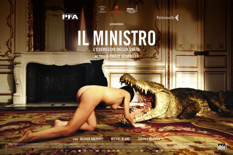 Stato Leviatano, ovviamente: entità sovrana cui assoggettarsi e sacrificare gli appetiti personali, giacché, come sentenzia Hobbes, 'I patti senza la spada sono solo parole'. Occorre forse evocare l'ambiguità del termine 'soggetto' come libero agente e soggezione al potere? Non è affatto fortuito che L'Exercice de l'État, personalizzato in italiano col titolo Il ministro - L'esercizio dello stato si apra con una sequenza onirica che ritrae una figura femminile completamente nuda darsi voluttuosamente in pasto a un gigantesco coccodrillo (conviene ricordare che una delle forme attribuite alla mostruosa creatura biblica è proprio il coccodrillo). Se la donna (Brigitte Lo Cicero), incarnazione della Repubblica e avvenente personificazione del corpo sociale, divarica le gambe, il rettile spalanca le fauci invitandola a entrare nella sua bocca. Il senso, almeno per chi scrive, è fin troppo evidente: lo Stato fagocita ogni desiderio e la conseguente erezione del ministro Saint-Jean (Olivier Gourmet) non fa che ribadire la chiave di lettura. La sua eccitazione notturna non è scatenata dalla semplice nudità femminile, ma dalla fantasia di divorare, dallinsaziabile famelicità del potere. Già, perché L'Exercice de l'État, secondo capitolo di una trilogia iniziata con Versailles (2009), è né più né meno che un film sul potere, sui suoi grotteschi cerimoniali, sulla sua libido frenetica e indifferenziata (non è dato conoscere l'orientamento del governo: l'aurea necessità dell'apparato trascende ogni determinazione politica).
