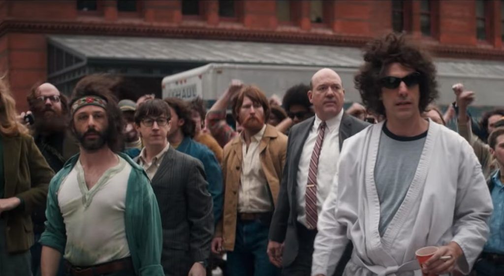 Le figure, i motivi e gli accenti di Aaron Sorkin sguazzano fra politica, idealismo e aula di tribunale, dispiegando dialettiche graffianti e battute fulminanti in una batteria di sbarramento dal moto perpetuo per stimoli e montaggio. Alla presenza di un giudice, di un caporedattore o di un presidente, è imperativa la chiosa morale, abbracciando e accompagnando verso la vittoria la scelta di campo: la promozione in simpatia, il trucco narrativo (l’esegesi della frase “Se deve scorrere del sangue, che scorra in tutta la città”) e la standing ovation finale sono meccanismi manipolatori leciti perché proposti all’interno di una commedia mascherata da resoconto storico, in cui l’imprecisione è voluta e urlata per una rivincita delle utopie degli sballati. L’intrattenimento della commedia drammatica indossa gli abiti della farsa che addita quella realmente accaduta, raccontabile solo come battuta da stand-up comedian, con lo sberleffo continuo dell’Abbie Hoffman di Sacha Baron Cohen (una macchietta impagabile, un capolavoro di scrittura e recitazione). La recensione al proprio approccio la scrive lo stesso Sorkin, quando oppone lo studente pronto a compromettersi nel realismo e l’hippie che sogna la rivoluzione: nello spettro totale delle posizioni possibili, lo sguardo del film viaggia dal tradito re-enactment all’idealismo (s)fumato. Sono proprio l’acido, la satira e la parodia che corrono sottotraccia (sotto-cronaca) a rendere il film prezioso: gli ammiccamenti e gli artifici completano il sorriso beffardo che, partendo da episodi paradossali (per lo più) realmente accaduti, sosta in un difficile equilibrio fra ricostruzione del dramma ed enfasi grottesca, per una miscela che, dalle parti di La Guerra di Charlie Wilson, avvicina Sorkin al David E. Kelley giudiziario, edificante e bizzarro, facendo sembrare Il Processo ai Chicago 7 una costola di Boston Legal.