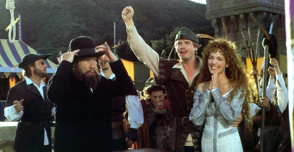 Mel Brooks, in diretta continuità con i fratelli Marx, è stato uno degli inventori del genere demenziale moderno ma pare che, da quando s’è separato da Gene Wilder (che, parimenti, da solo non ha firmato grandi cose: qui ha un cameo), non riesca a sfornare un film comico all’altezza del suo nome. E si ripete stancamente, con un’altra parodia di un film di successo, nel caso il Robin Hood con Kevin Costner (apertamente citato attraverso Balla Coi Lupi) che, già di suo, era una (bruttina) versione in commedia delle gesta del leggendario ladro. Le gag funzionano a mala pena o si sono già viste (nei film di Brooks, per altro, che già nel 1975 creò il serial Le avventure di Robin Hood contro l’odioso sceriffo) o sono di una banalità disarmante, facili e grossolane. Verso la parte finale fa capolino qualche invenzione più gustosa (tipo la “ola”, la gag dei copioni, le ombre cinesi…) ma lo standard resta comunque basso (ma il film ha avuto successo e per molti è un cult). La ditta Zucker-Zucker-Abrahams, che spinge assai di più sul medesimo terreno di caricature, citazioni cinefile (Brooks è pure immodesto: si autocita in Mezzogiorno e Mezzo di Fuoco) e riferimenti all’attualità, fa sembrare l’autore un relitto antiquato. Il livello del tutto è leggermente alzato dalla partecipazione, in cameo, degli attori della sua scuderia (il migliore dei quali è Dom De Luise, simil-Brando Il Padrino) e di un Patrick-Star Trek-Stewart nei panni di Riccardo III. Immancabili i numeri musical.